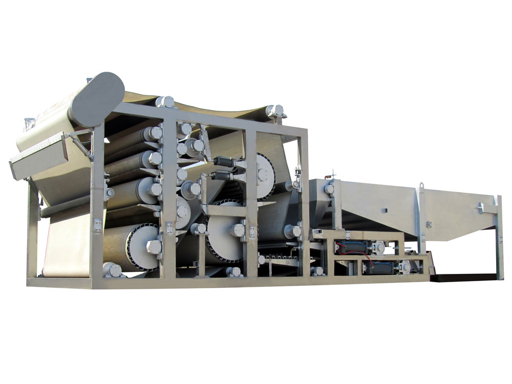 污泥首先通過的是由藍(lán)海環(huán)境設(shè)計(jì)制造的水中造粒器,它可使污泥與藥液發(fā)生無動(dòng)力混合,充分發(fā)揮絮凝的作用。之后,污泥進(jìn)入重力脫水區(qū),在該區(qū)域內(nèi),含固率大于1%的污泥可以直接進(jìn)行脫水,脫水后的污泥再進(jìn)入壓榨脫水區(qū),通過了雙重脫水的污泥其干度即在18-22%之間。另外,本設(shè)備采用的是氣控調(diào)偏技術(shù),在保證濾帶以狀態(tài)運(yùn)行之外還延長了濾帶的使用壽命。